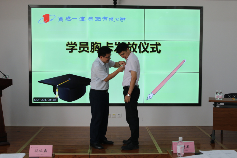 ? ? ? 培訓(xùn)前,進(jìn)行了青島一建商學(xué)院“領(lǐng)航班”第一期培訓(xùn)學(xué)員發(fā)放胸卡儀式,由集團(tuán)公司董事長、總裁、商學(xué)院院長馬樹軍親自為學(xué)員代表高玉磊佩戴胸卡,高玉磊代表本期培訓(xùn)班所有學(xué)員進(jìn)行了發(fā)言,他表示,學(xué)員們一定會珍惜集團(tuán)商學(xué)院提供的學(xué)習(xí)機(jī)會,潛心求學(xué),遵規(guī)守紀(jì),共創(chuàng)集團(tuán)美好未來。