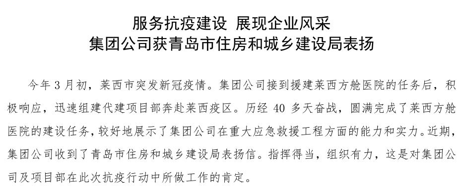 服務(wù)抗疫建設(shè) 展現(xiàn)企業(yè)風(fēng)采 集團(tuán)公司獲青島市住房和城鄉(xiāng)建設(shè)局表?yè)P(yáng)